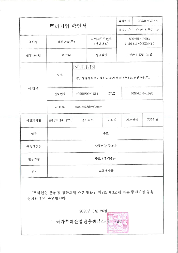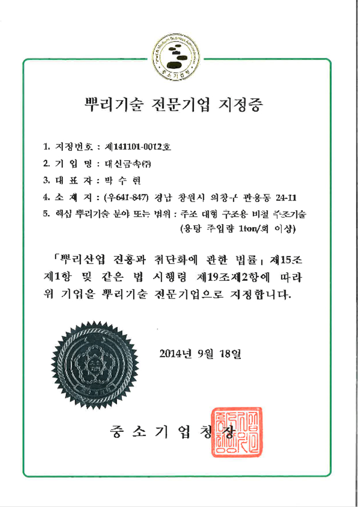 뿌리기업 전문기업 지정증