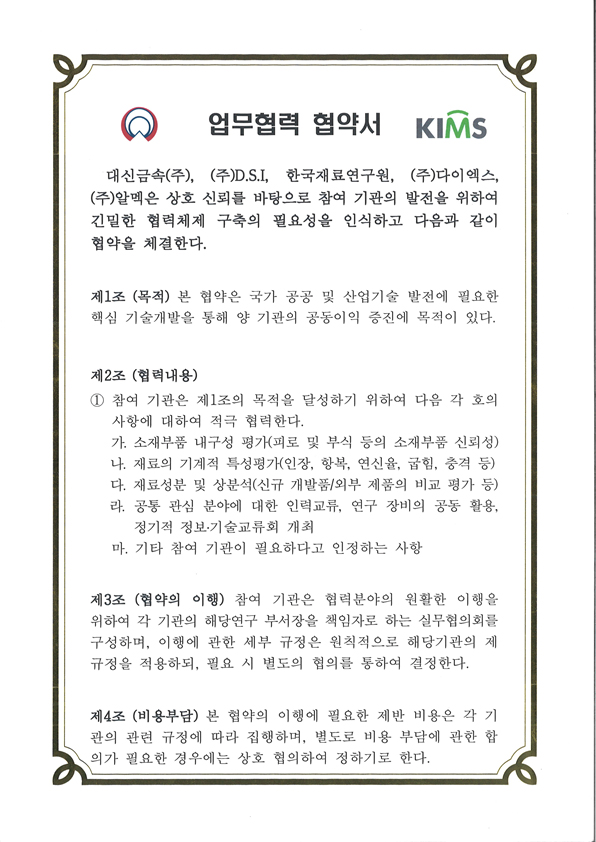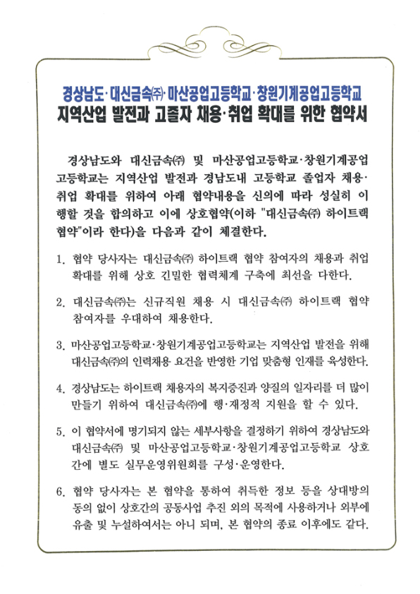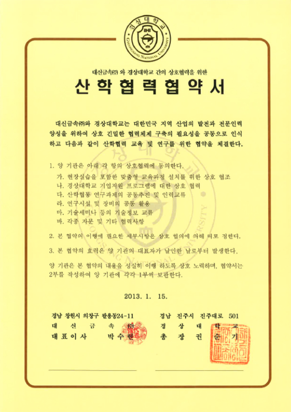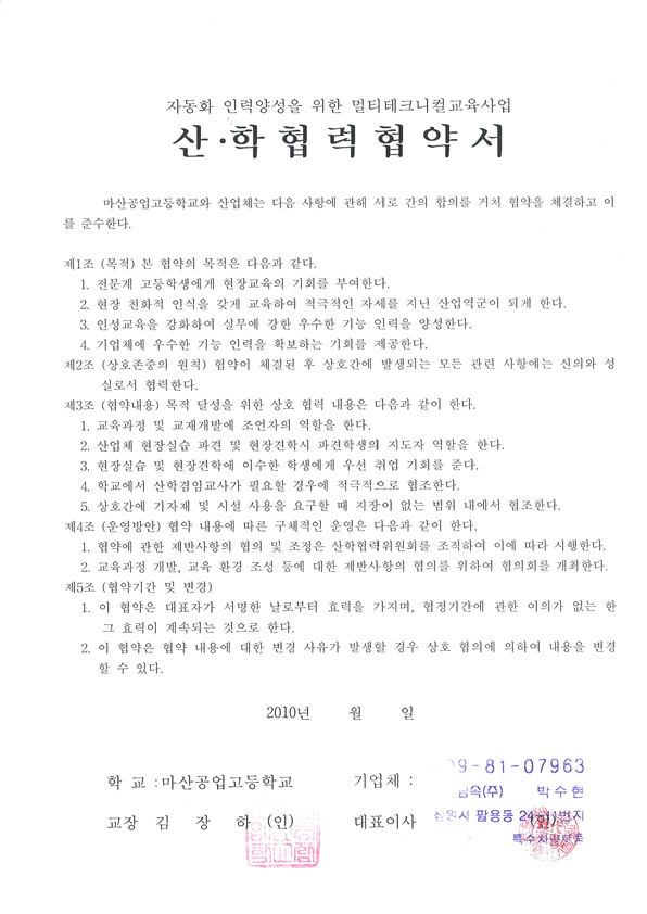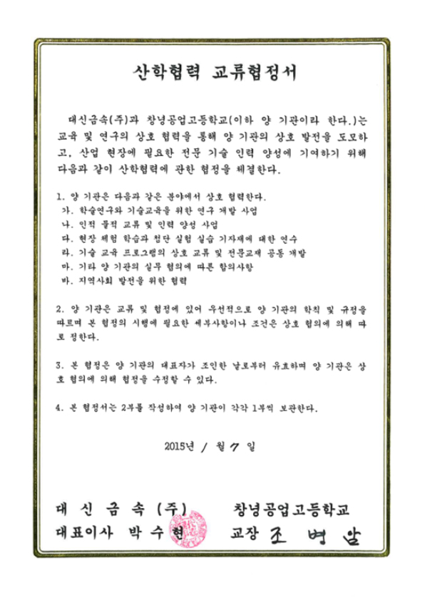 산학협력 교류협정서창녕고등학교 | 개발과제 및 내용 | 개발기간 | 개발수준 | 개발비용 (정부출연금 / 금형비) |